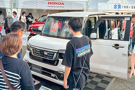 Honda純正アクセサリーブースには、新型N-BOX CUSTOM、ステップ ワゴン「AIR」、ヴェゼル、「踏み間違い加速抑制システム」を搭載したN-BOXの4台が並びました。