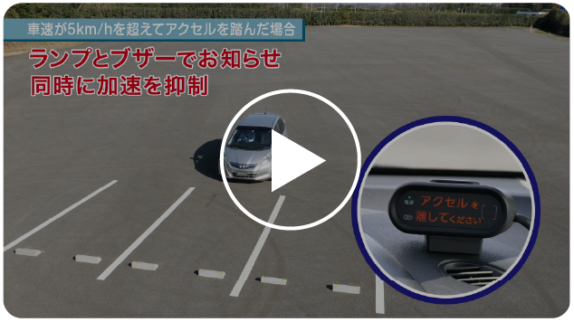発進時に、フロントバンパーに設置したセンサーが前方の障害物を検知すると、ランプとブザーでお知らせします。さらに、その状態からアクセルペダルが強く踏み込まれたとシステムが判断した場合には、加速を抑制すると同時に、ランプとブザーでお知らせします。また、後退時にアクセルペダルが強く踏み込まれたとシステムが判断した場合にも、加速を抑制すると同時に、ランプとブザーでお知らせします。