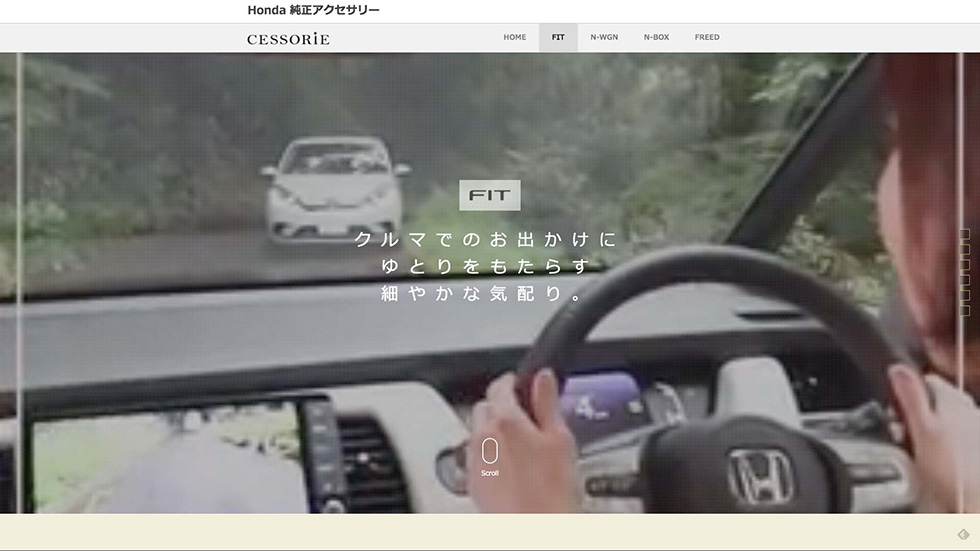 「CESSORIE」は、クルマやカーアクセサリーへの興味・関心が低い方にも使用シーンをイメージしやすいように、車種ごとにカーライフのシーンを設定。お子様がいらっしゃるご家族や、運転に自信がない方におすすめの便利なアイテムを、カーライフでの具体的なシーンを通しイメージ映像でご紹介しています。今回追加したFITのページでも、“クルマのお出かけにゆとりをもたらす細やかな気配り”をキャッチコピーに、安心サポートアイテムである「ドライブレコーダー」や「親水ドアミラー」など6アイテムを紹介しています。