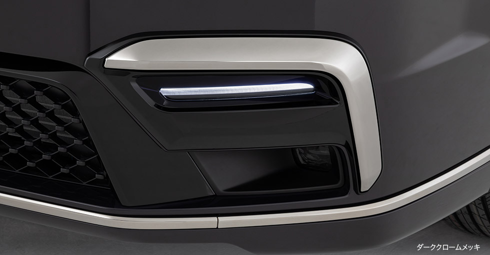 メタリック基調とLEDビームライトが、フォグライトガーニッシュの存在感を放ち、ワイドで低重心な印象を強調。フロントフェイスに力強さを与えます。