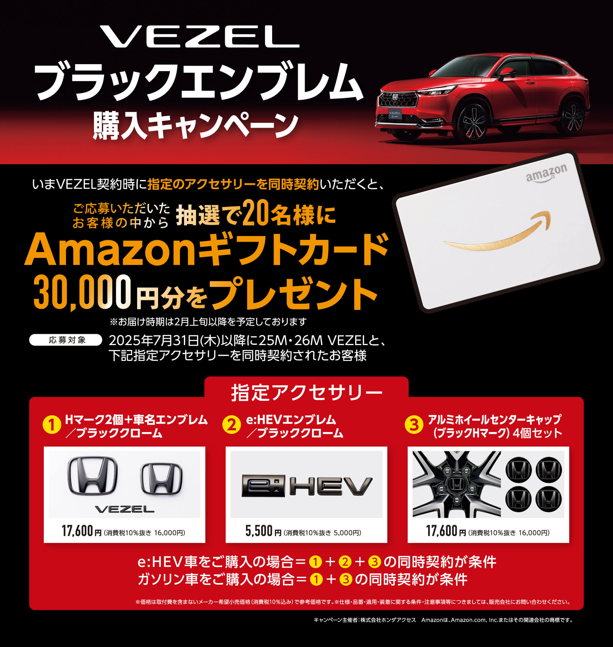 2025年7月31日以降に25M・26M VEZELと、下記指定アクセサリーを同時契約されたお客様が対象となります。ご応募いただいた中から抽選で20名様に「Amazonギフトカード30,000円分」をプレゼント。期間中、応募フォームにアクセスしてご応募ください。