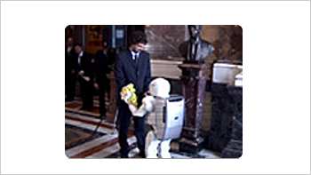 - もうひとつ、ASIMOには大切な目的がありました。それはチェコを代表する作家、故カレル・チャペック氏に花をたむけるためです。チャペック氏は1920年に発表した戯曲の中で“ロボット”という造語を用いました。以来“ロボット”は世界的に知られるようになり、広く一般に使われる言葉となります。つまり彼は“ロボット”生みの親ともいえる存在なのです。プラハ国立博物館を訪れたASIMOは菊の花束を、今は亡きチャペック氏の代わりに館長へ贈りました。かつてはSF的な存在でしかなかった“ロボット”、いま彼がASIMOを見たらどんなに驚くことでしょう。国立博物館の荘厳な空気の中、大勢の来場者や取材陣に囲まれてデモンストレーションをしてみせるASIMOは、白く小さな体で大きな夢と未来を象徴しているかのようでした。