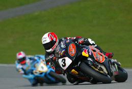 予選で4番手のタイムをマークしてフロントローのグリッドポジションを獲得したルターだったが、第1レースではスタートに失敗。そこから猛然と追い上げを見せた。序盤グレン・リチャーズ(カワサキ)とシーン・エメット(ドゥカティ)が接触・転倒し、4周にわたってセーフティカーがコースを走った。セーフティカーがコースを離れ、バトルが再開した直後に、ルターはトップグループに加わっていたのである。