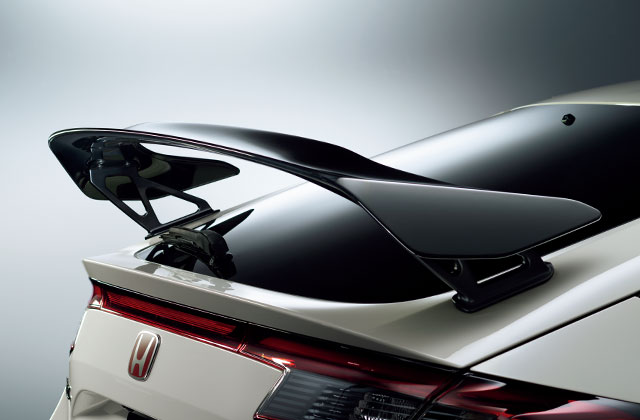TYPE Rの象徴となるリアスポイラーは、翼断面形状と迎角を徹底的に追求。アルミダイキャスト製の軽量ステーを採用し、強大なダウンフォースと低ドラッグを実現。