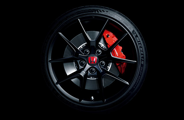 TYPE R専用開発の265mm幅ワイドタイヤと、優れた接地性を叶えるリバースリム構造の軽量・高剛性19インチアルミホイールにより、高いグリップ性能を獲得。