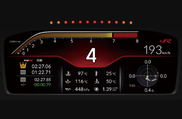 +Rモード専用メーターにはタコメーターなどに加え、Honda LogRの走行情報をカスタマイズ表示。上部にはLEDレブインジケーターをしつらえ、シビアな走行下でのスムーズな変速を促す。