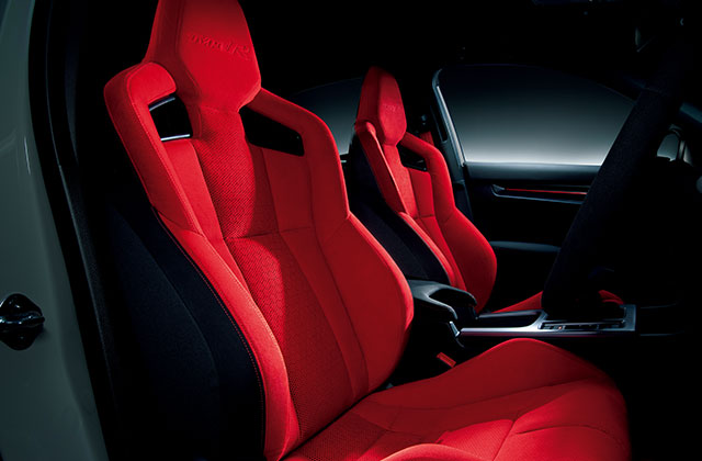 鮮烈なレッドのシートが、サーキットにおける強烈なGからドライバーの操縦姿勢を保持する。強化フレーム/高硬度パッドを採用した多面体形状の専用シートは、身体が密着するエリアの通気性にも配慮。