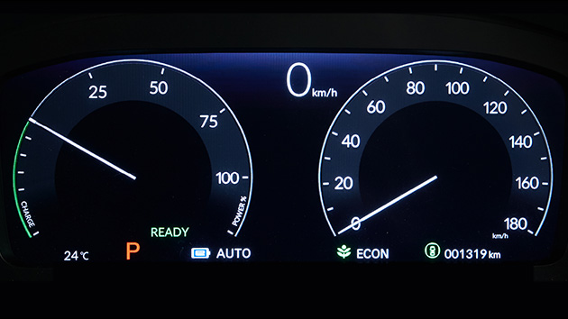 視認性に優れた2眼表示の大型フルグラフィックメーターを搭載。左側にはパワー/チャージメーターを配置し、中央には安全運転支援情報を表示します。