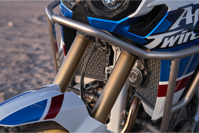 フレームもAfrica Twinを踏襲し、異型楕円形状のメインパイプを採用したセミダブルクレードルを採用。サスペンションは長距離走行やガレ場走行など様々な使い勝手に対応するために、専用セッティングとしている。フロントは、252mmのロングストロークを確保した倒立タイプ。アウターチューブの表面処理は、硬度が高く耐磨耗性に優れた、カシマコート※を採用している。リアは、走破性と快適性を両立し、240mmのアクスルトラベルを持つプロリンク方式のスイングアーム。前後共に、フルアジャスタブルタイプのサスペンションを採用し、荷物の積載や路面状況の変化などに対応。ホイールは「CRF450 RALLY」同様に、フロント21インチ、リア18インチのスポークホイールを採用している。