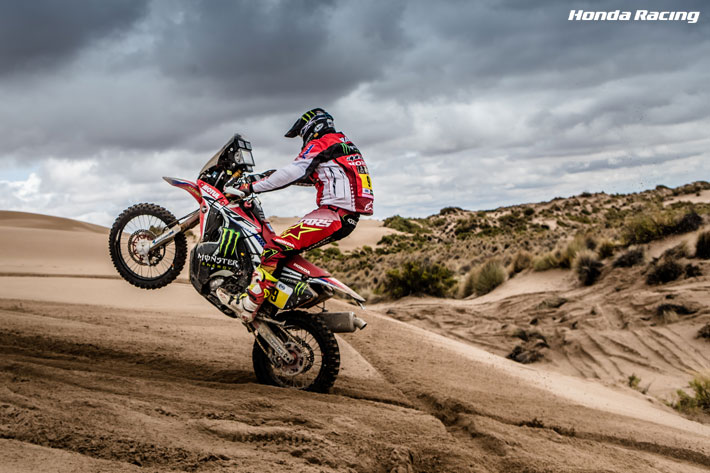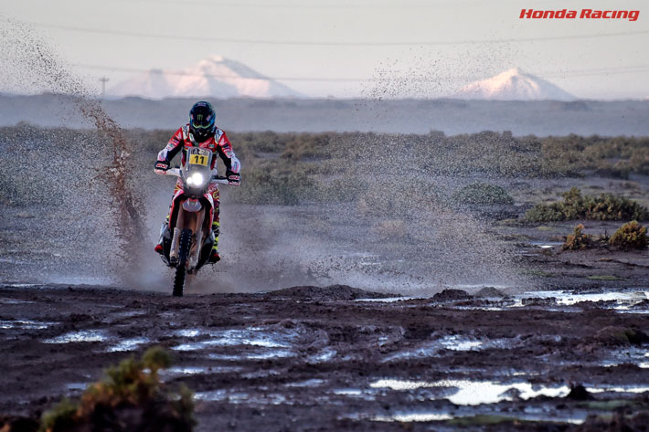ラパスでの休日が明け、2週目に入ったダカールラリー。ステージ7、ステージ8と2つのステージでは、チームからのサポートを受けずに走るマラソンステージが行われています。1月10日のステージ8は、マラソンステージの2日目。マラソンステージの初日に、Monster Energy Honda Teamのリッキー・ブラベックとパウロ・ゴンサルヴェスによる1-2フィニッシュという結果に続き、ステージ8において、CRF450 RALLYで快走をみせたのはホアン・バレダでした。