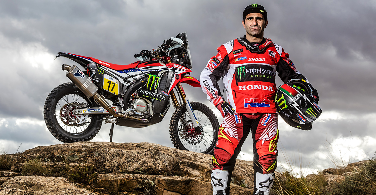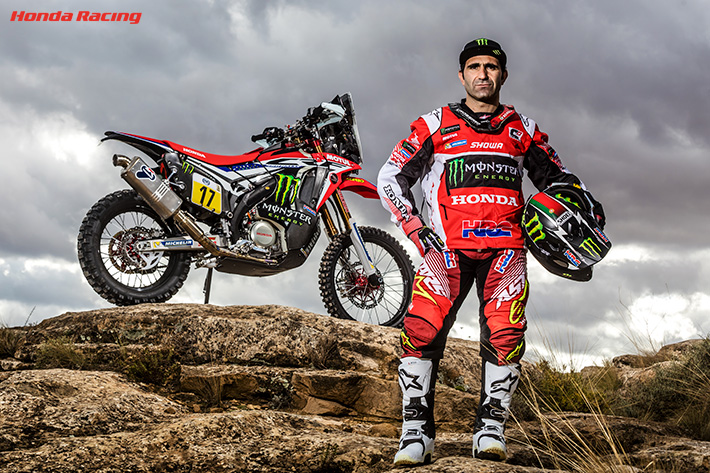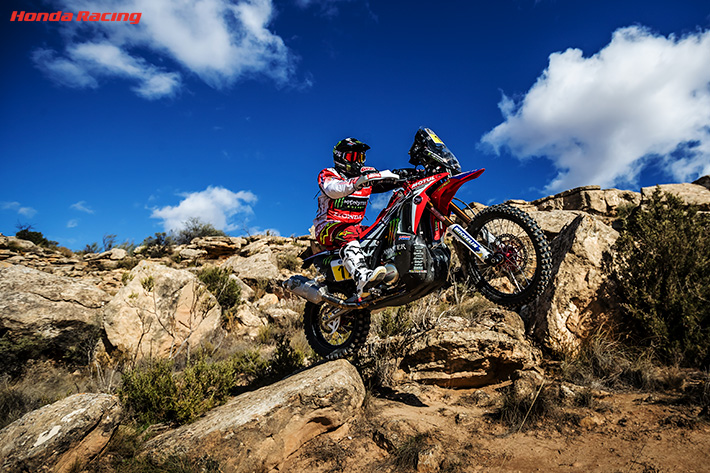 ダカールラリー2016では、第4ステージで勝利を挙げ、総合首位争いを展開。しかし、メカニックのサポートが受けられないマラソンステージで、ラジエターに枝が刺さるという不運に見舞われて後れを取り、さらには巻き返しを図っていた第11ステージで転倒を喫してリタイアとなりました。2017年は、その雪辱を遂げるべく、再びHonda CRF450 RALLYで挑みます。