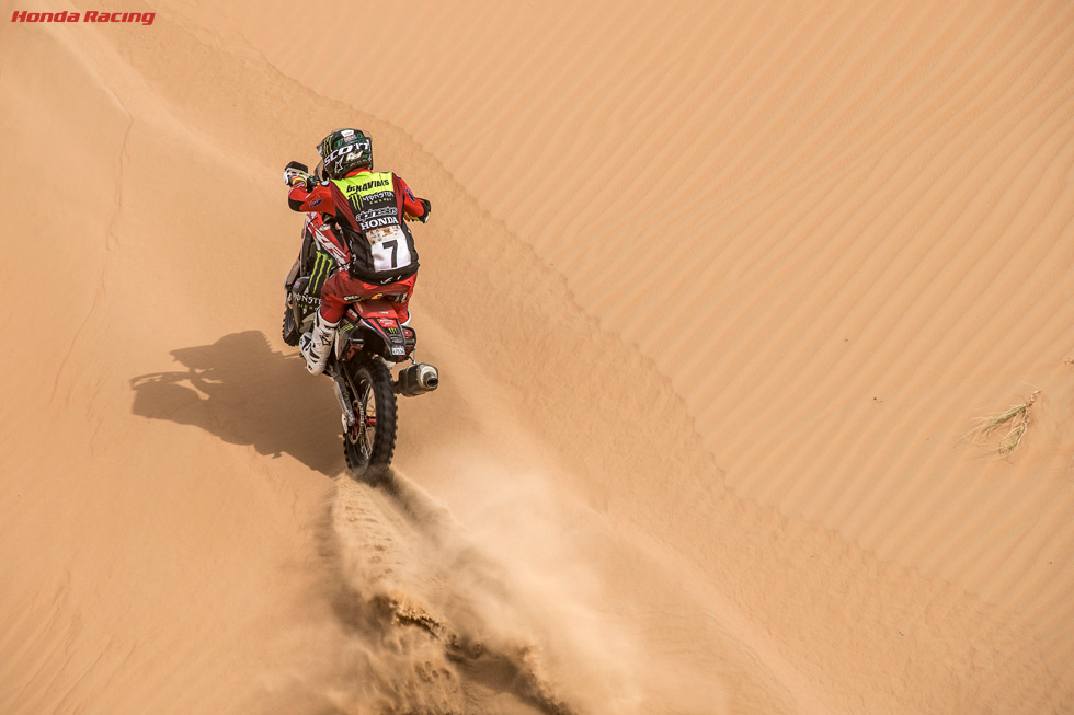 Monster Energy Honda Teamのトップはベナバイズでした。前日の転倒で肩を打撲しましたが、この日はタイムロスをリカバーするべく走った結果、2番手タイムでステージを終えました。