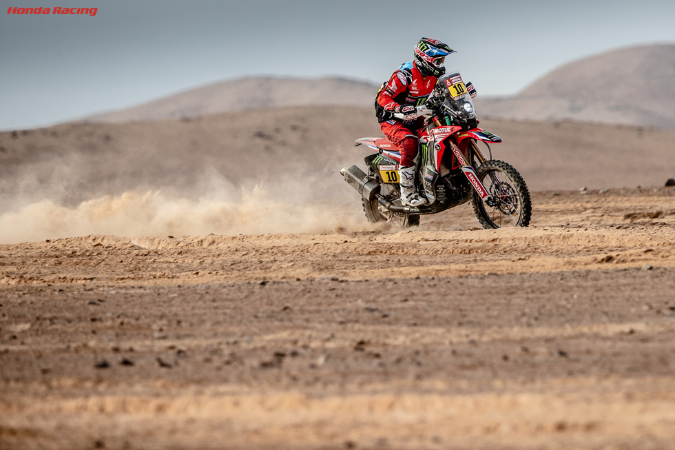 この日に設けられた区間タイム計測ポイントのすべてでファステストタイムを叩きだし、完全なステージウインを飾ったリッキー・ブラベック。ほか3名のMonster Energy Honda Teamメンバーも、安定したペースでトップ10圏内を確保。ラリー前半の山場を控え好調さを維持し、マラソンステージ後半へと進みます。