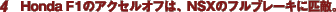 F1マシンは、強大なダウンフォースで車体を路面に押し付けているため、ブレーキを踏まなくても、アクセルオフだけで大きく減速する。Honda