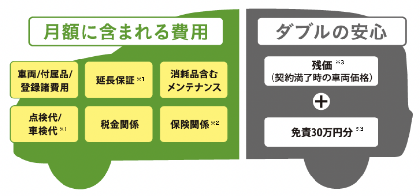 車両返却時の(一財)日本自動車査定協会の基準に基づくカーチェックによる内外装に関する減点が100点以内、かつ月間走行距離1,000km以下が条件となります。この条件を超えた場合、内外装に関する減点1点につき1,000円、走行距離1kmにつき車種毎の規定金額がお客様のご負担となります。また違法改造や事故の修復歴があった場合は別途規定の精算金額をご負担いただきます。(月間走行距離は1,500kmもお選びいただけます。その際、最終回のお支払い金額は変動します。)