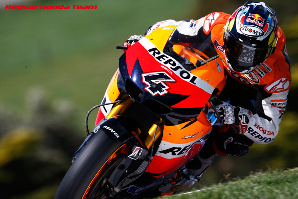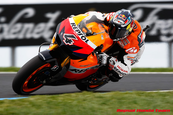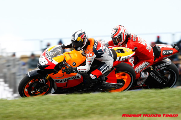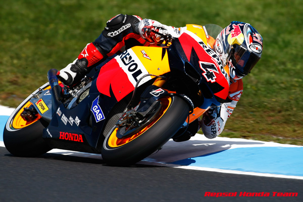 第16戦オーストラリアGPの予選は、午前中は青空が広がるも、午後は時折雨が降る不安定な天候となり、難しいセッションとなった。MotoGPクラスは、ほぼドライコンディションで走れたが、セッション終盤に雨が降り、最後のアタックが完全にできない選手たちも多かった。その中でトップタイムをマークしたのは、ホームGPで過去3連勝中のケーシー・ストーナー(ドゥカティ)で、2番手にホルヘ・ロレンソ(ヤマハ)、3番手にベン・スピース(ヤマハ)。