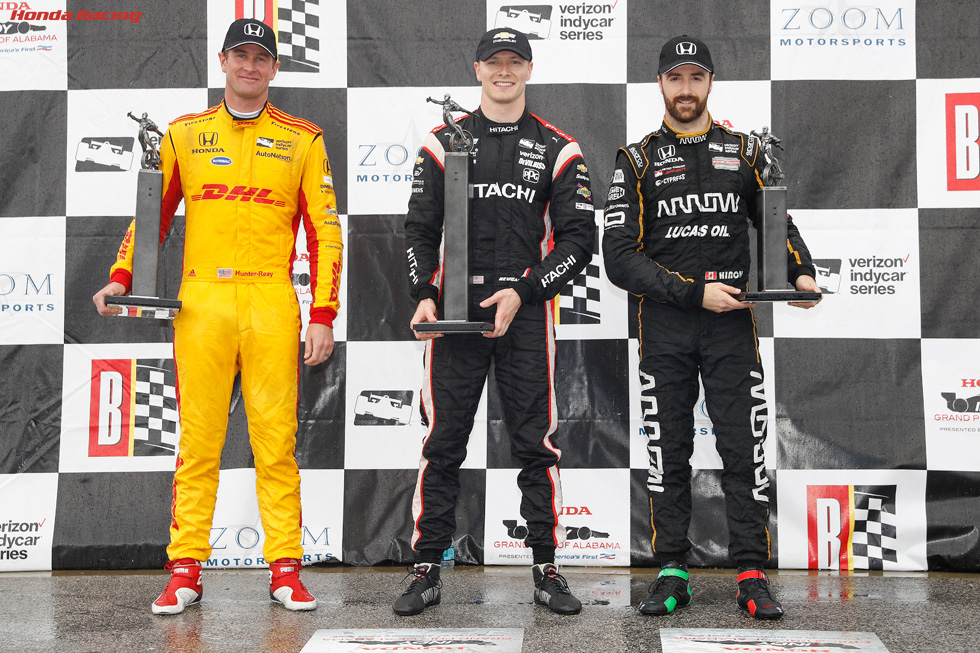 3位にはジェームズ・ヒンチクリフ(Schmidt Peterson Motorsports)で表彰台には2人のHondaドライバーが上りました。雨、晴れ、そしてまた雨と天候に翻ろうされたレースをほかの多くのHondaドライバーたちも全力で戦い、4位はルーキーのロバート・ウィッケンズ(Schmidt Peterson Motorsports)、5位はブルデー、6位はディクソン、7位はグレアム・レイホール(Rahal Letterman Lanigan Racing)、そして8位には佐藤琢磨(Rahal Letterman Lanigan Racing)と、Honda勢が2位から8位までを占めました。