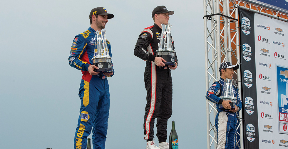 前戦のインディ500と同じく、佐藤琢磨(Rahal Letterman Lanigan Racing)がレース終盤を大きく盛り上げました。予選9番手だった佐藤は、得意のウエットコンディションで次から次にライバル勢をパス。30周目にルーキーながら大活躍していたフェリックス・ローゼンクビスト(Chip Ganassi Racing)をパスして3番手に浮上。ロッシとニューガーデンを追いかけました。完全なドライコンディションで佐藤は上位2人と同じペースは保てませんでしたが、ローゼンクビストのアタックを緻密かつ大胆な走りではねのけ続け、インディ500に続いて2戦連続のトップ3フィニッシュを果たしました。佐藤のポイントスタンディングは、今大会終了時点で4位です。