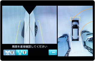 - マルチビューカメラシステムでは立体物が歪んだり、上部が画面に映らないなど、画面の映像と実際の状況が異なることがあります。また、カメラの映し出す範囲は限られていますので、画面だけを見て走行すると接触事故等、思わぬ事故を引き起こすおそれがあります。必ず目視やミラーなどで後方および周囲の安全を直接確認して運転してください。路面が滑りやすくなっているなどの場合は、タイヤのスリップにより、マルチビューカメラシステムの予測ガイド線と車両の実際の動きにずれが生じることがあります。バンパーの両コーナー付近、バンパーの下や黒線上にあるものは映りません。映し出す映像は雨の日、夜間など天候や周囲の状況によって見えにくくなることがあります。
