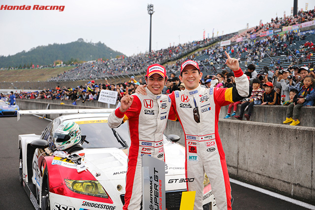中山友貴(2位 #16 MUGEN CR-Z GT / GT300クラスチャンピオン)「本当に一言では表せないくらい、たくさんのことがあったシーズンでした。第2戦くらいからは優勝が期待できるパフォーマンスを手に入れていましたが、レース戦略などさまざまなことが絡み合い、結果的に優勝できたのはエキシビションレースのアジアン・ル・マン・シリーズの1戦のみとなりました。それでもチーム無限とHondaの皆さんが信頼性の高いマシンに仕上げ、僕たちをチャンピオンに導いてくれたことを本当にうれしく思っています。今シーズンを通じ、ハイブリッドシステムはライバルをオーバーテイクするとき、またオーバーテイクされそうになったときのディフェンスに用いることが有効であることが確認できました。今年得たノウハウを、今後の戦いに活用していきたいと考えています」