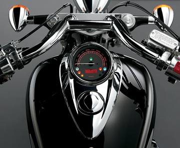 よりゆとりのクルージングのために。VT1300CSには、フットブレーキを操作するだけで前・後輪が連動するコンビブレーキシステムに、ABS(アンチロック・ブレーキ・システム)機能を組み合わせた「コンバインドABS」仕様を設定。ブレーキのかけ過ぎや急な路面変化によるタイヤロック傾向を検知するとタイヤロックを回避し、車体コントロール性と制動性能の維持をサポート。ABSモジュレーターは低層配置とし、VT1300CSのスタイリングの美しさを損なわないよう配慮されている。