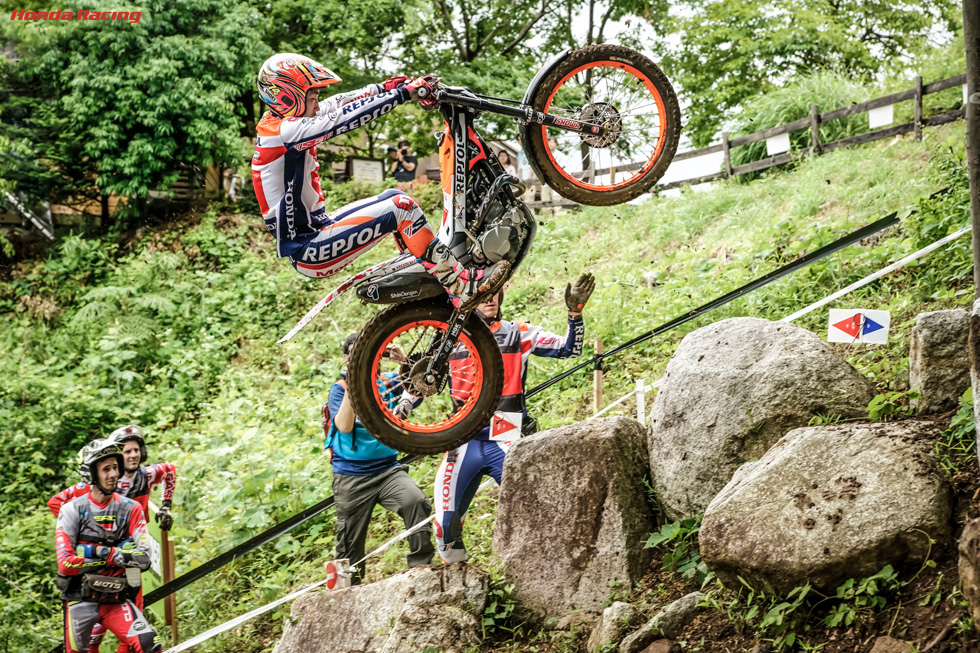 日本大会は、アウトドアで行われる2019年のトライアル世界選手権シリーズの中で唯一2日間開催の大会です。その初日、8日土曜日の試合で、トニー・ボウは開幕戦に続いて見事な勝利を飾りました。そして凱旋を果たした藤波貴久は3位表彰台を獲得。表彰台に、Repsol Honda Teamのライダーが2人並びました。