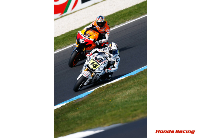 初日5番手のマルコ・メランドリ(Team San Carlo Honda Gresini)は、ドライコンディションでは思うようにタイムを伸ばせず、10番手とポジションを落とした。初日12番手の青山博一(Interwetten Honda MotoGP)も、思うようにドライコンディションでのセッティングを決められず13番手。3戦ぶりに復帰のダニ・ペドロサ(Repsol Honda Team)は、手術をした左鎖骨の痛みがひどく、思うようにバイクもコントロールできなかった。そのため、レース距離を走りきるのは難しいと判断。今大会の欠場を決めた。次戦ポルトガルGPから復帰する予定だ。