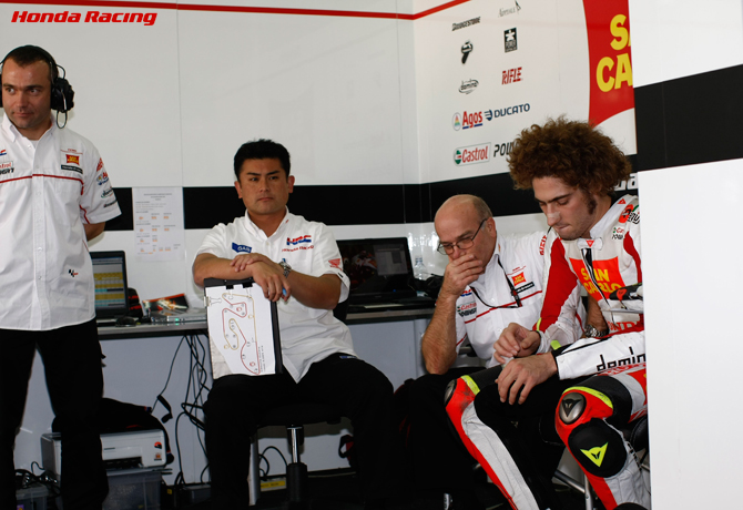 シーズン後半戦に入ってから調子を上げているシモンチェリは、今大会も好調をキープし、Honda勢で最上位の4番手で初日を終えた。午前中1回目の走行では、ケーシー・ストーナー(ドゥカティ)がトップタイムをマーク。以下、ロレンソ、ドヴィツィオーゾと続き、シモンチェリがそのあとにつけた。午後2回目の走行でもシモンチェリは好走を見せて、1回目よりタイムを上げて4番手をキープ。2日目予選での、MotoGP初のフロントロー獲得に期待をつないだ。