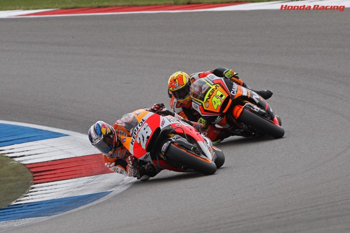 チームメートのダニ・ペドロサは、予選3番手からオープニングラップで4番手につけると、スリックタイヤを装着したマシンにチェンジしても引き続き4番手をキープ。終盤になると、スタートからピタリとマークしていたアレックス・エスパルガロ(FORWARD YAMAHA)をパスして3番手に浮上し、マルケス、ドヴィツィオーゾに続き、3位でチェッカーを受けました。Repsol Honda Teamの両選手がそろって表彰台に立つのは今季6度目。ペドロサは、今大会5位のバレンティーノ・ロッシ(ヤマハ)と同ポイントの総合3位。次戦ドイツGPはペドロサが得意とするサーキットだけに、今季初優勝と総合2位奪還が期待されます。