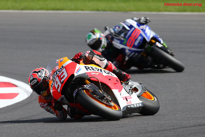 前戦チェコGPでは4位と、悔しいレースになったマルケス。しかし、今大会はフリー走行、予選、ウォームアップのすべてのセッションでライバルを圧倒する完ぺきな3日間となり、難しいコンディションとなった決勝でも、追いすがるロレンソを振りきる快走をみせ、優勝に輝きました。