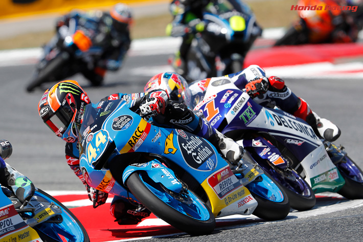 Moto3クラスは、ホームグランプリに闘志を燃やすホアン・ミル(Leopard Racing)が2戦ぶり今季4勝目を達成しました。今大会もスタートからゴールまで、10台前後がトップ集団を形成。目まぐるしくポジションを入れ替えました。そんな中、今季、接戦で強さを見せるミルが、ロマーノ・フェナティ(Marinelli Rivacold Snipers)、ホルヘ・マルティン(Del Conca Gresini Racing Moto3)との戦いを制しました。地元ファンの期待に応えたミルには、スタンドから大きな拍手が送られました。