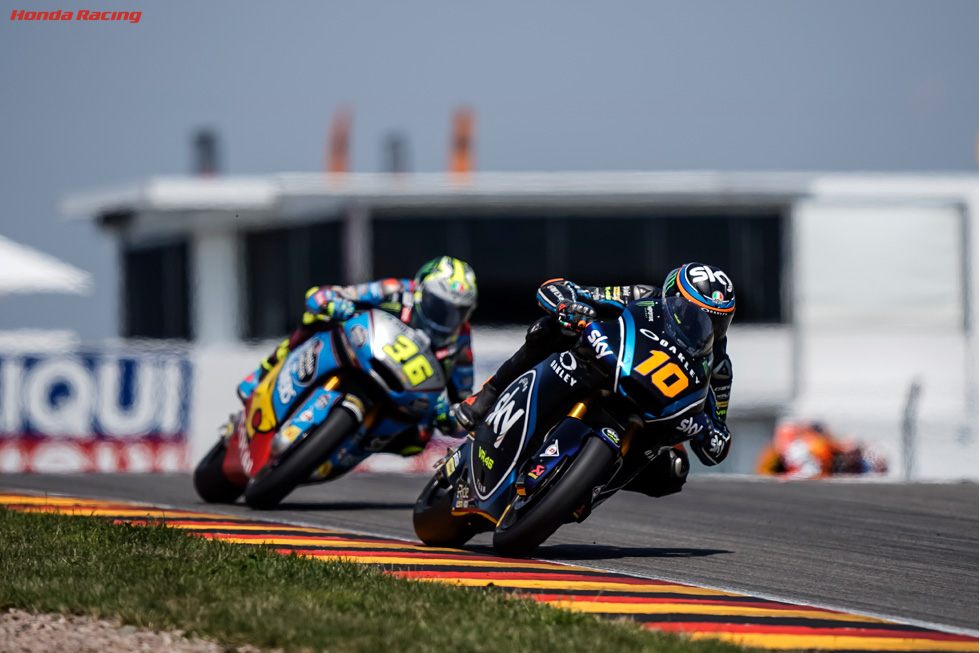 Moto2クラスは、今季2回目のポールポジション(PP)を獲得したマティア・パシーニ(Italtrans Racing Team)がオープニングラップに転倒、予選5番手のロレンソ・バルダッサーリ(Pons HP40)も2周目に転倒するなど、優勝候補が次々に脱落する激しい戦いに。さらにパシーニの転倒を回避するために予選3番手のフランセスコ・バグナイア(SKY Racing Team VR46)もコースアウトして大きく遅れるなど、波乱の展開となりました。