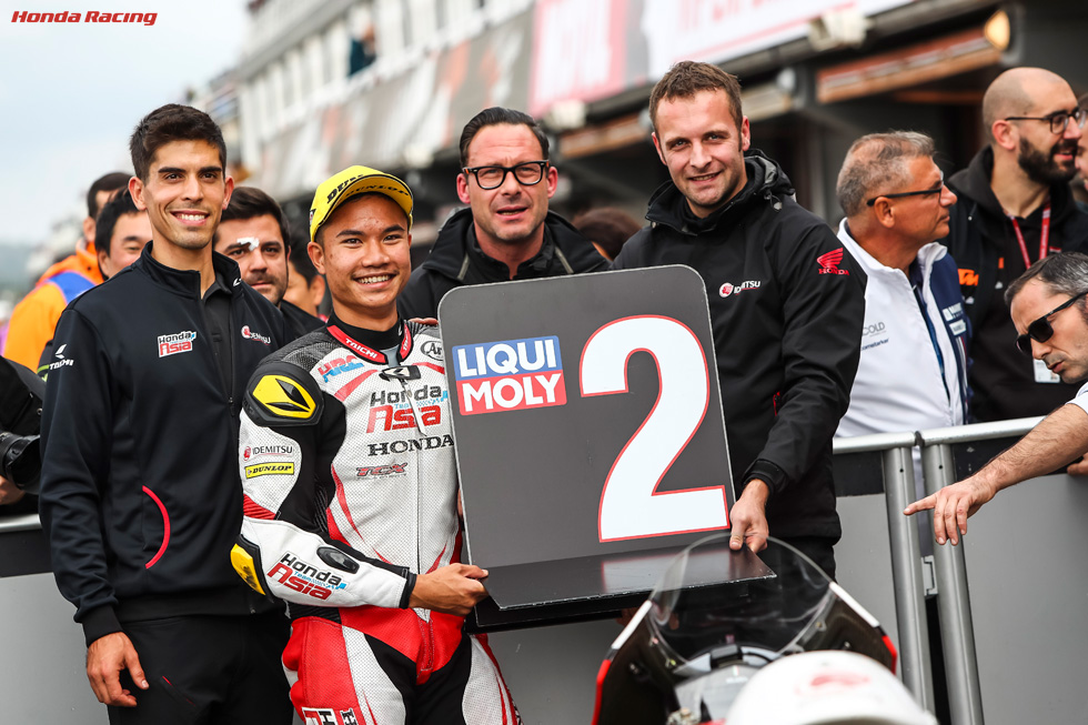 Moto3クラスは、トニ・アルボリーノ(Marinelli Snipers Team)が今季2回目のポールポジション(PP)を獲得、決勝では、念願の初表彰台を目指します。2位にはアティラプワパ(Honda Team Asia)で初のフロントローを獲得、3番手にジョン・マクフィー(KTM)と続きました。