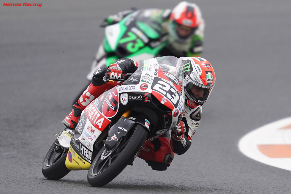 Moto3クラスは、FP1,FP2ともに微妙なコンディションとなりましたが、FP1で転倒を喫した國井勇輝(Honda Team Asia)がFP2でも元気のある走りを見せて12番手。この数戦の好調を結果につなげました。