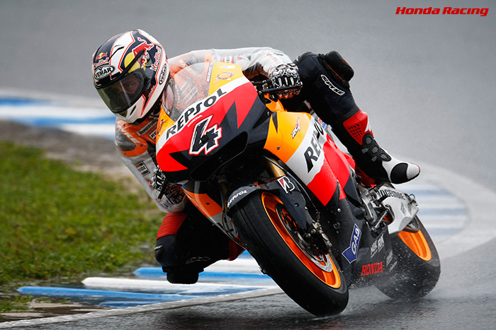 開幕戦カタールGPではケガが完治せず、力走するも11位。もう1人、前の年からMotoGPクラスにステップアップし、新たにペドロサのチームメートとなったアンドレア・ドヴィツィオーゾは5位と、こちらはひとまず悪くないスタートを切っていた。そして、さらにマシンを詰めていきたい状況での日本GPだったが、あいにくの雨模様。