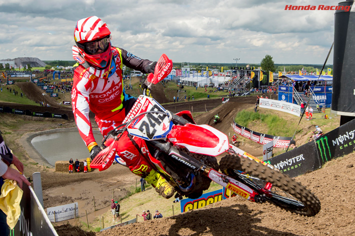 ドイツ東部のライプツィヒ近郊トイチェンタルの市街地裏手にあるタルケッセルサーキットは、当時Honda World Motocrossに所属していたイブジェニー・ボブリシェフ(Team HRC)が、2011年にMX1初優勝を達成した記念すべきモトクロスコースです。昨年当地で行われたドイツGPでは、ティム・ガイザー(Team HRC)が総合2位、ボブリシェフが総合3位でポディウムに登壇。ガイザーがポイントリーダーに返り咲き、タイトル獲得に対するモチベーションを高めたラウンドとなりました。