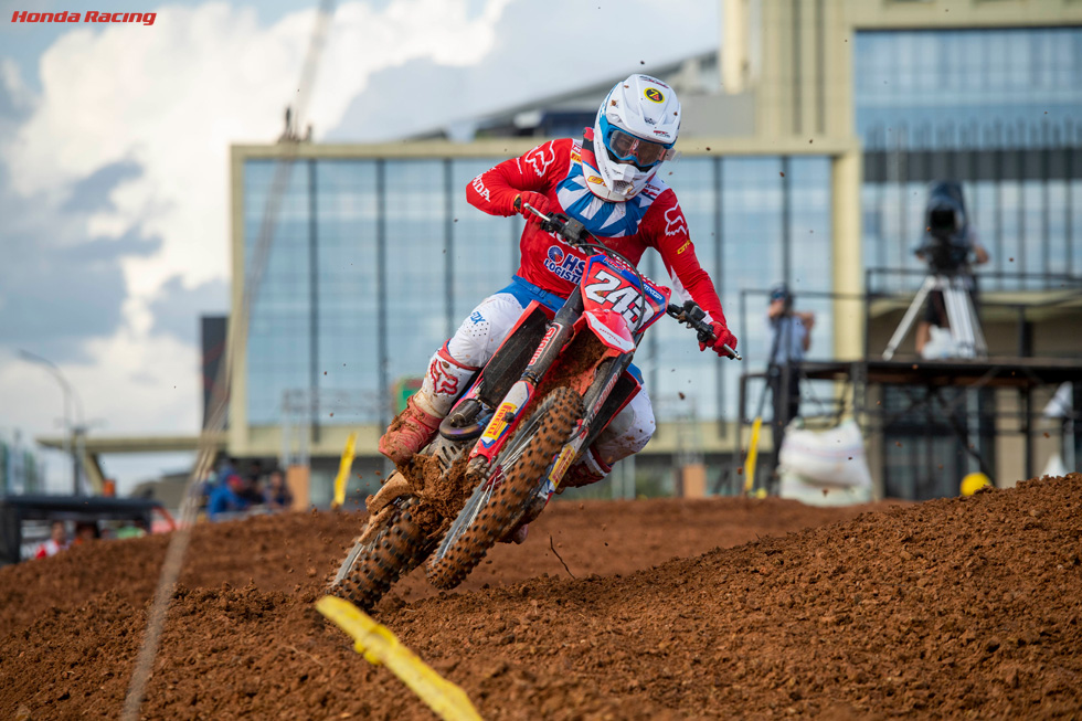 モトクロス世界選手権第11戦が、インドネシアで行われました。会場は昨年のバンカ島パンカルピナンから、スマトラ島パレンバンに移動しましたが、高温多湿との闘いとなる側面に相違はなく、インドネシアは依然としてシリーズ中の難関の一つです。パレンバン郊外のショッピングモールに隣接する空き地に特設されたコースは、1周1分30秒ほどの規模。粘土質の路面はドライであればハードパックになりますが、にわか雨の影響もあってワダチの発生も要素に加わりました。