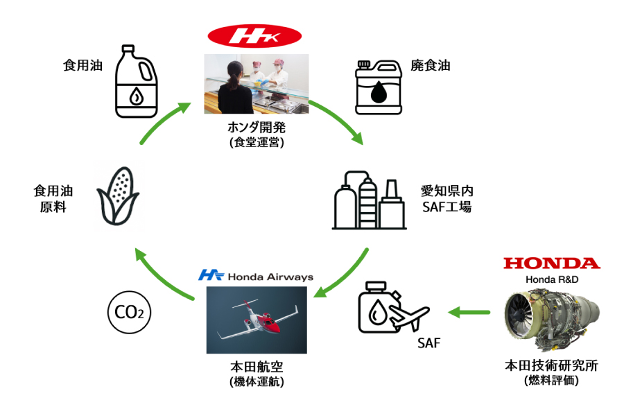 Hondaの社員食堂を運営するホンダ開発株式会社が、愛知県近郊のHonda事業所の食堂から排出される廃食油を提供し、航空エンジンの研究開発を担う株式会社本田技術研究所が、製造されたSAFの性状等を評価します。さらに、ホンダジェットを含む航空機の運航を行う本田航空株式会社が、愛知県近郊の空港においてSAFを給油することで、グループ内における資源循環を実現し、Hondaグループ全体での排出量削減を目指します。
