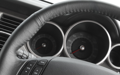 ドライバーの手にしっとりとなじむ本革巻きステアリング。タフな印象のインストルメントパネル周りに上質なイメージを持たせています。