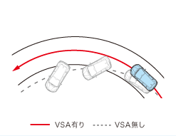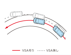 ■VSAは、あくまでドライバーのブレーキ操作やアクセル操作等を補助するシステムです。したがってVSAがない車両と同様に、コーナー等の手前では十分な減速が必要であり、ムリな運転までは制御できません。安全運転をお願いします。