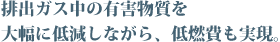 排出ガス中の有害物質、NMHC(非メタン炭化水素)、NOx(窒素酸化物)、CO(一酸化炭素)をそれぞれ低減し、国土交通省「平成17年排出ガス基準75% 低減レベル」認定を取得。また同時に、優れた燃費性能を実現しています。
