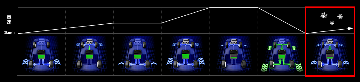リアモーターだけで駆動する「EVドライブ」、モーターとエンジン両方の駆動力を使う「ハイブリッドドライブ」、エンジンのみで駆動する「エンジンドライブ」。3つの走行モードと、前輪駆動/後輪駆動/四輪駆動などの駆動方式を自在に制御。ドライバーの要求と走行状況に応じて、最もエネルギー効率のよい走行モードと最適な駆動方式を自動的に選択して走行します。