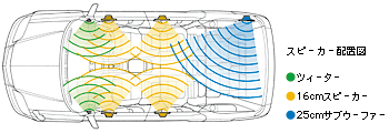 | 室内空間に合わせて、入念に音響設計された高品位オーディオシステム。専用設定のFIXイコライザー、別体アンプ付25cmサブウーファーをはじめとする7スピーカーを組み合わせ、低音域の量感を重視した音響チューニングを施しました。車内のどの位置でも臨場感あふれるダイナミックなサウンドが楽しめます。プレーヤーには、インダッシュ6連奏CDチェンジャー(CD-R/CD-RW対応)※に加え、MDプレーヤー(MDLP対応)を採用しています。 |