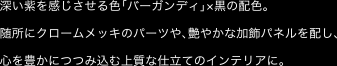 新しい感覚のガーニッシュや、数々のメッキ加飾が、室内を一層艶やかに、上質に彩る。