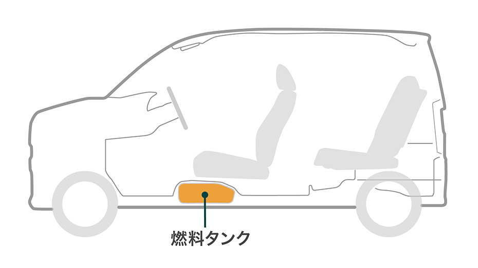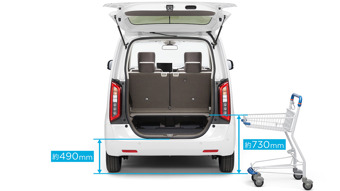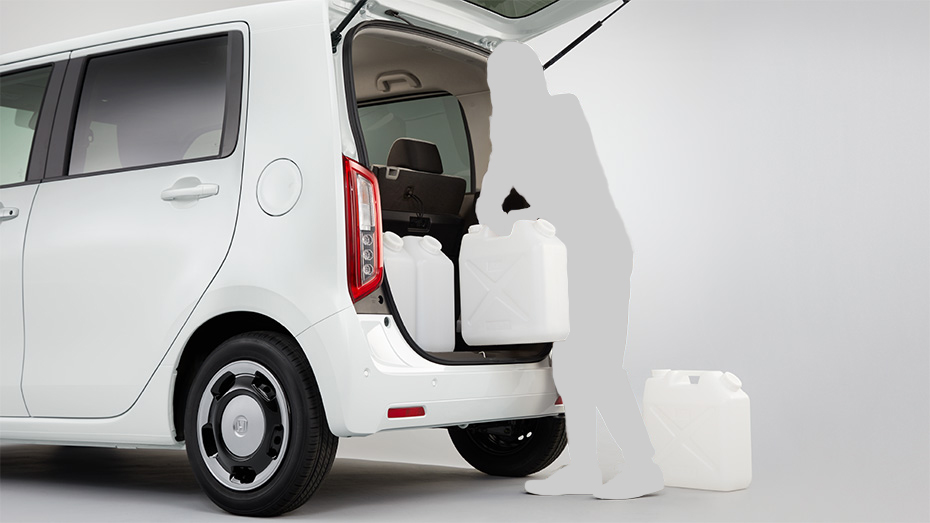 後席や荷室の下に置かれることが多い燃料タンクを、前席の下に配置するHondaの独自技術「センタータンクレイアウト」を採用。後席から後ろの段差を大幅に減らすことで、床面をより低くすることができ、そのぶん容量も拡大。広くて使い勝手のよい荷室を実現しました。