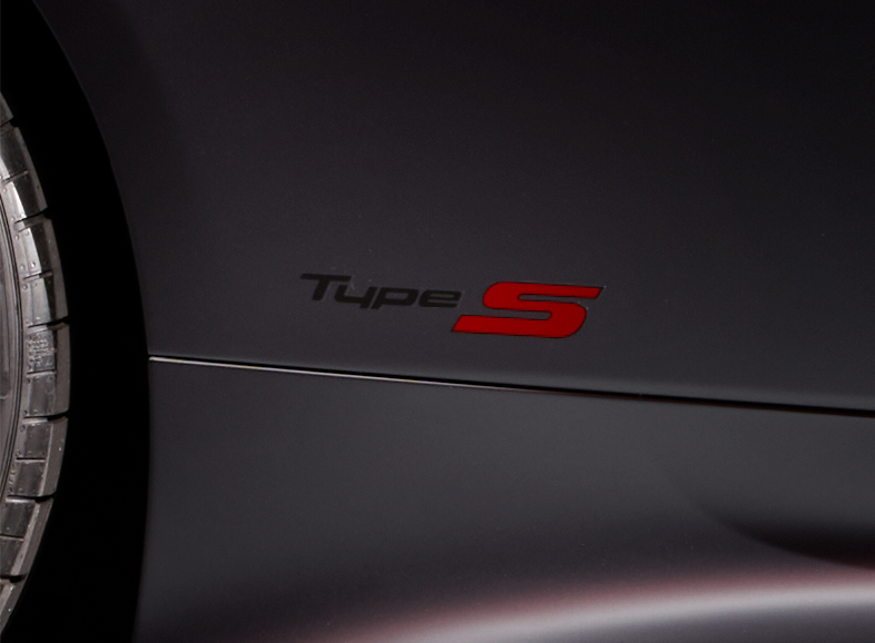 地を這うような、低く構えたシルエット。空力性能を高め、さらにワイド&ローで立体的な造形となったアグレッシブなスタイリング。フロントはフロア下への整流を考慮したカーボンファイバー フロントスポイラーと、トータル・エアフロー・マネジメントを考慮したインテーク形状により、一目見てType Sとわかる存在感を放ちます。リアはよりワイドスタンスを強調し、レーシングマシンからインスパイアされた迫力の大型リアディフューザーが、圧倒的な走りを予感させます。