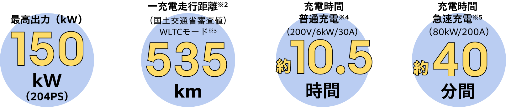 ※1 一充電走行距離は定められた試験条件での値です。お客様の使用環境(気象、渋滞等)や運転方法(急発進、エアコン使用等)に応じて一充電走行距離は大きく異なります。とくに1日当たりの走行距離、バッテリーの充電状態、エアコン使用による影響を大きく受けます。