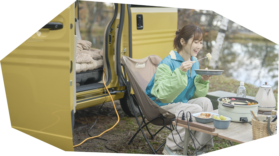 EVはアイドリングなしでエアコンが使えるから、車中泊の夜中に暑さや寒さで目が覚めても、周りを気にせずエアコンをON。さらに、AC外部給電機能を使えば外出先でホットプレートや電気ケトルなども使えます。近場のアウトドアなら、航続距離を気にせずセカンドカーで気軽に出かけられるのも魅力。