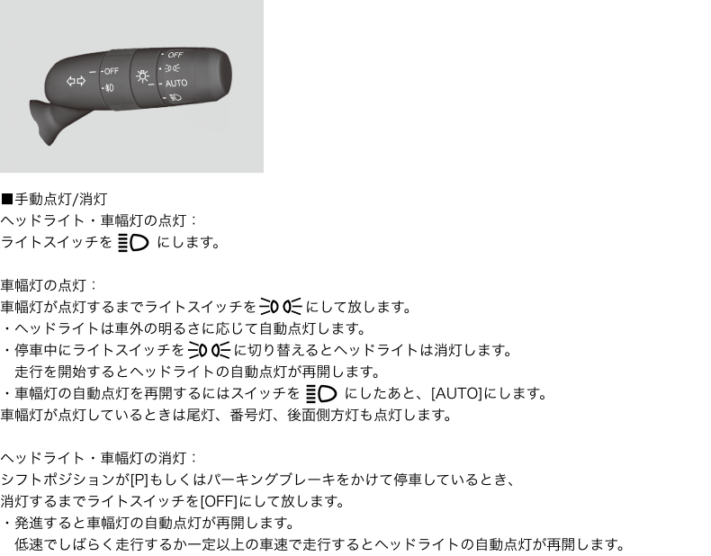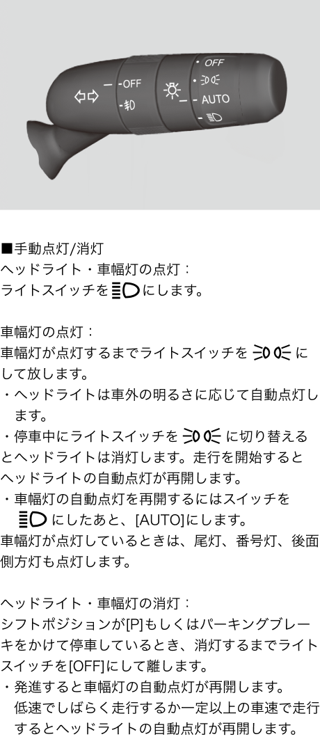 車外の明るさに応じて自動で点灯します。手動で点灯/消灯させることもできます。