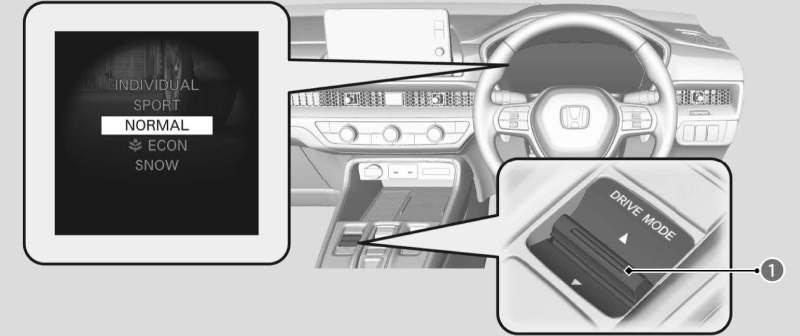 ドライブモードスイッチ①を押してモードを選択します。選択しているモードはメーターに表示されます。